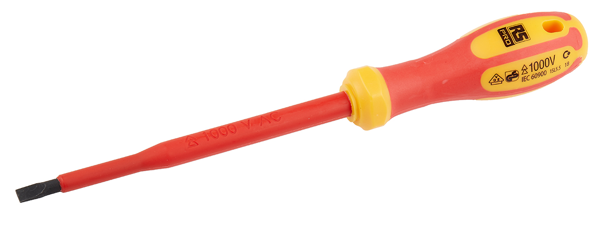 This is 125 mm Chrome Vanadium Molybdenum Steel Insulated Screwdriver Slotted 1 x 5.5 mm Tip Plastic manufactured by RS Pro. The manufacturer part number is 125-3082. VDE/1000V Approval Options - yes. This insulated screwdriver screwdriver offers extreme comfort and a non-slip grip. The tip is 5.5 x 1 mm in size. Its comfortable handle is manufactured from durable plastic material. In addition, it has a phosphate blade finish . The blade has a length of 125 mm. It has an overall length of 225 mm. The built-in exquisite tip is a slotted tip. In addition, its blade is made up of chrome vanadium molybdenum steel material .