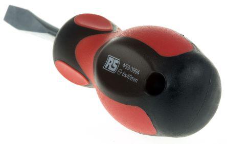 This is 40 mm Chrome Vanadium Steel Ergonomic Screwdriver Flared 6 mm Tip Bi-material manufactured by RS Pro. The manufacturer part number is 459-3994. The tip is 6 mm in size. This stubby screwdriver offers extreme comfort and a non-slip grip. The built-in exquisite tip is a flat tip. The blade has a length of 40 mm. Its comfortable handle is manufactured from durable bi-material material. In addition, its blade is made up of chrome vanadium steel material .