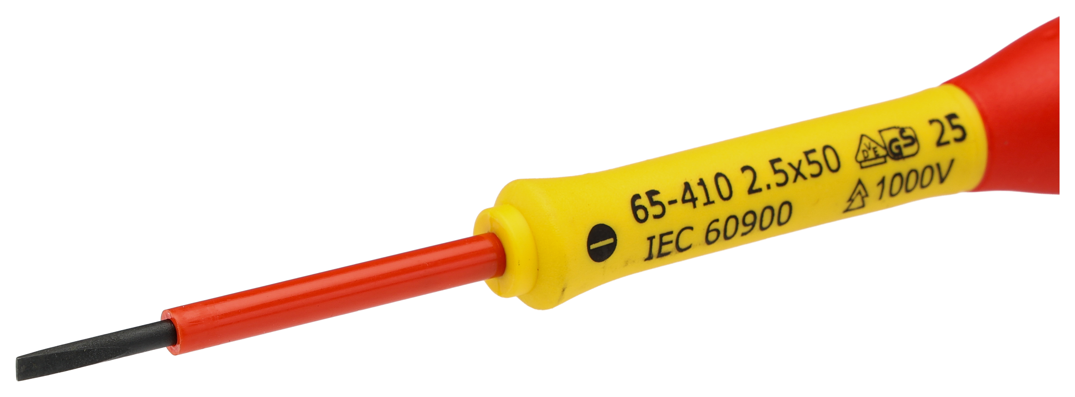 This is 50 mm Steel Insulated Screwdriver Slotted 2.5 mm Tip manufactured by Stanley. The manufacturer part number is 0-65-410. VDE/1000V Approval Options - yes. This insulated screwdriver screwdriver offers extreme comfort and a non-slip grip. The tip is 2.5 mm in size. Its comfortable handle is manufactured from durable bi-material material. In addition, it has a chrome vanadium blade finish . The blade has a length of 50 mm. It has an overall length of 155 mm. Insulation Option: vde 1000v. The built-in exquisite tip is a slotted tip. In addition, its blade is made up of steel material .
