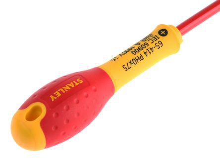This is 75 mm Chrome Vanadium Steel Insulated Screwdriver Phillips PH0 Tip manufactured by Stanley. The manufacturer part number is 1-65-414. VDE/1000V Approval Options - yes. The tip is ph0 in size. This standard screwdriver offers extreme comfort and a non-slip grip. The blade has a length of 75 mm. The built-in exquisite tip is a phillips tip. In addition, its blade is made up of chrome vanadium steel material .