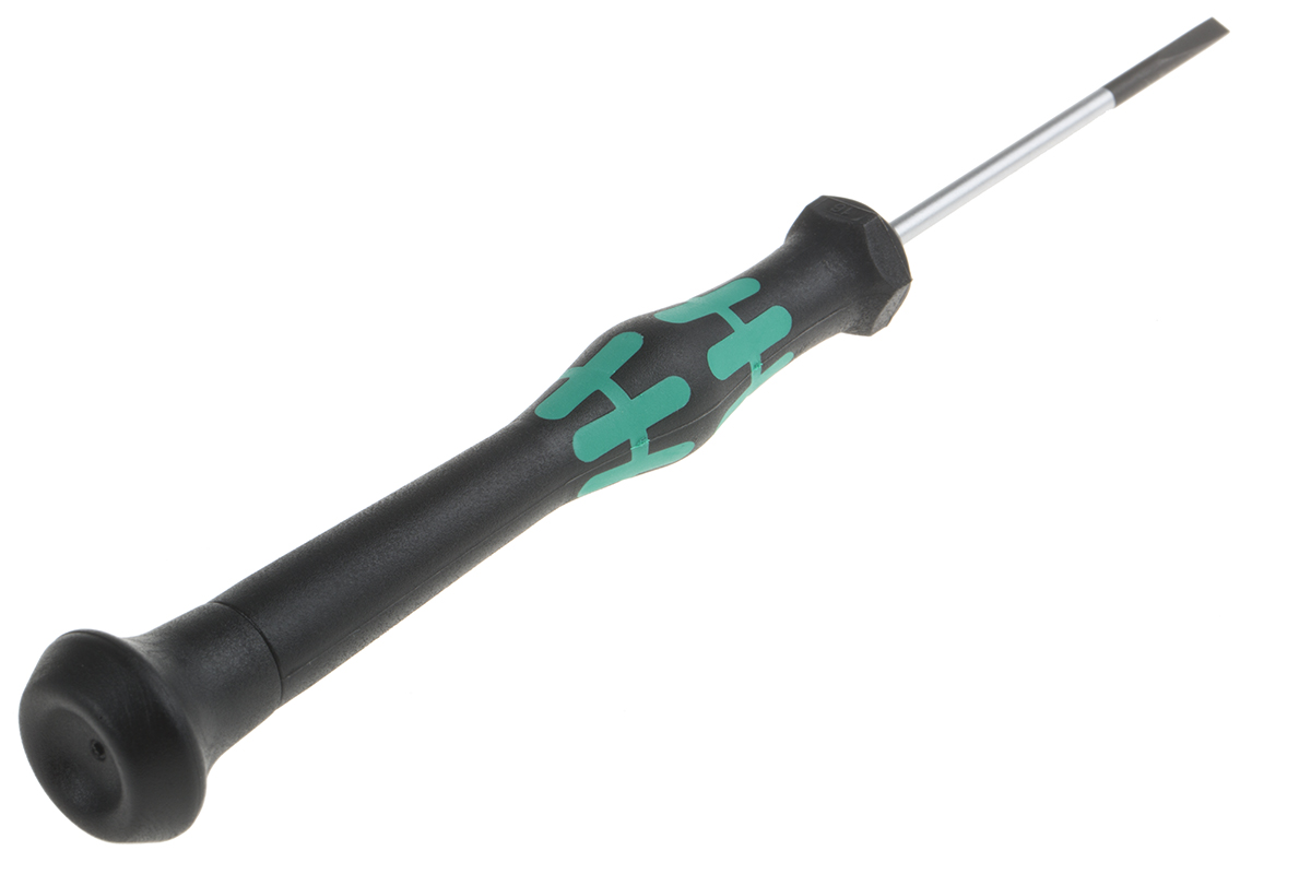 This is Slotted ESD Screwdriver 0.4 x 2.5 mm Tip 50 mm manufactured by Wera. The manufacturer part number is 117994. The tip is 2.5 x 0.4 mm in size. This precision screwdriver offers extreme comfort and a non-slip grip. In addition, it has a chrome blade finish . The blade has a length of 50 mm. It has an overall length of 147 mm. The built-in exquisite tip is a flat tip.