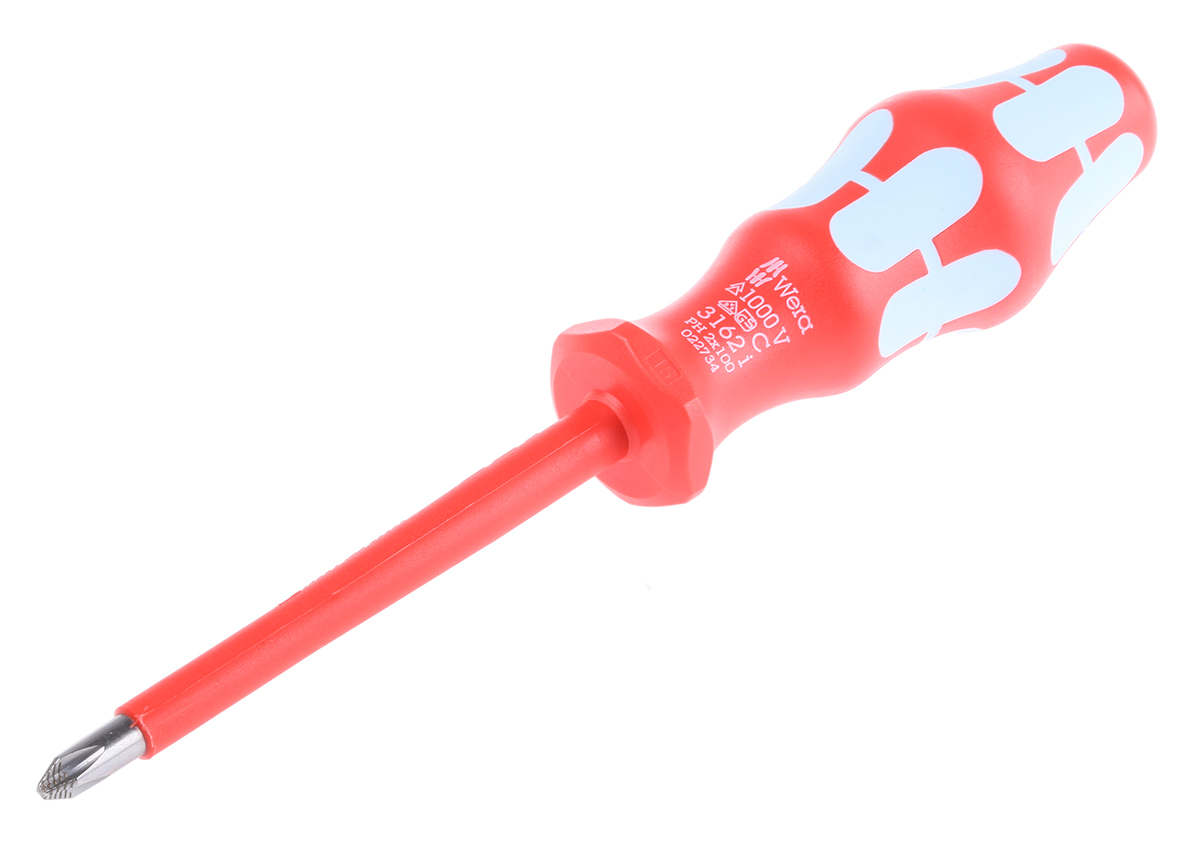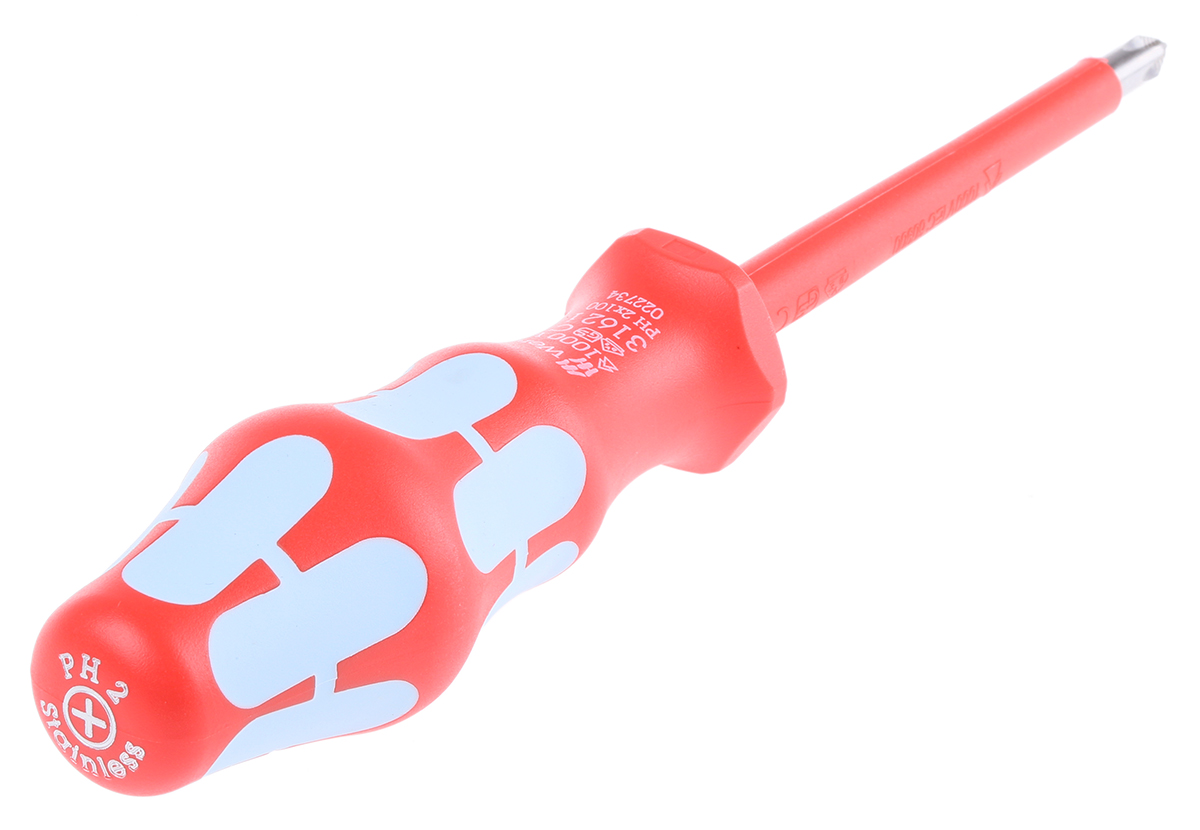 This is VDE 1000V Approved Phillips VDE Screwdriver PH2 Tip 100 mm Stainless Steel manufactured by Wera. The manufacturer part number is 022734. VDE/1000V Approval Options - yes. The tip is ph2 in size. This insulated screwdriver screwdriver offers extreme comfort and a non-slip grip. The blade has a length of 100 mm. It has an overall length of 161 mm. The built-in exquisite tip is a phillips tip. In addition, its blade is made up of stainless steel material .