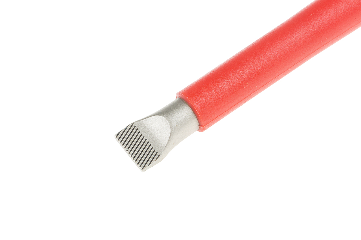 This is VDE 1000V Approved Slotted Insulated Screwdriver 10 mm Tip 200 mm manufactured by Wera. The manufacturer part number is 006140. VDE/1000V Approval Options - yes. The tip is 10 mm in size. This long reach screwdriver offers extreme comfort and a non-slip grip. The blade has a length of 200 mm. It has an overall length of 112 mm. The built-in exquisite tip is a flat tip.