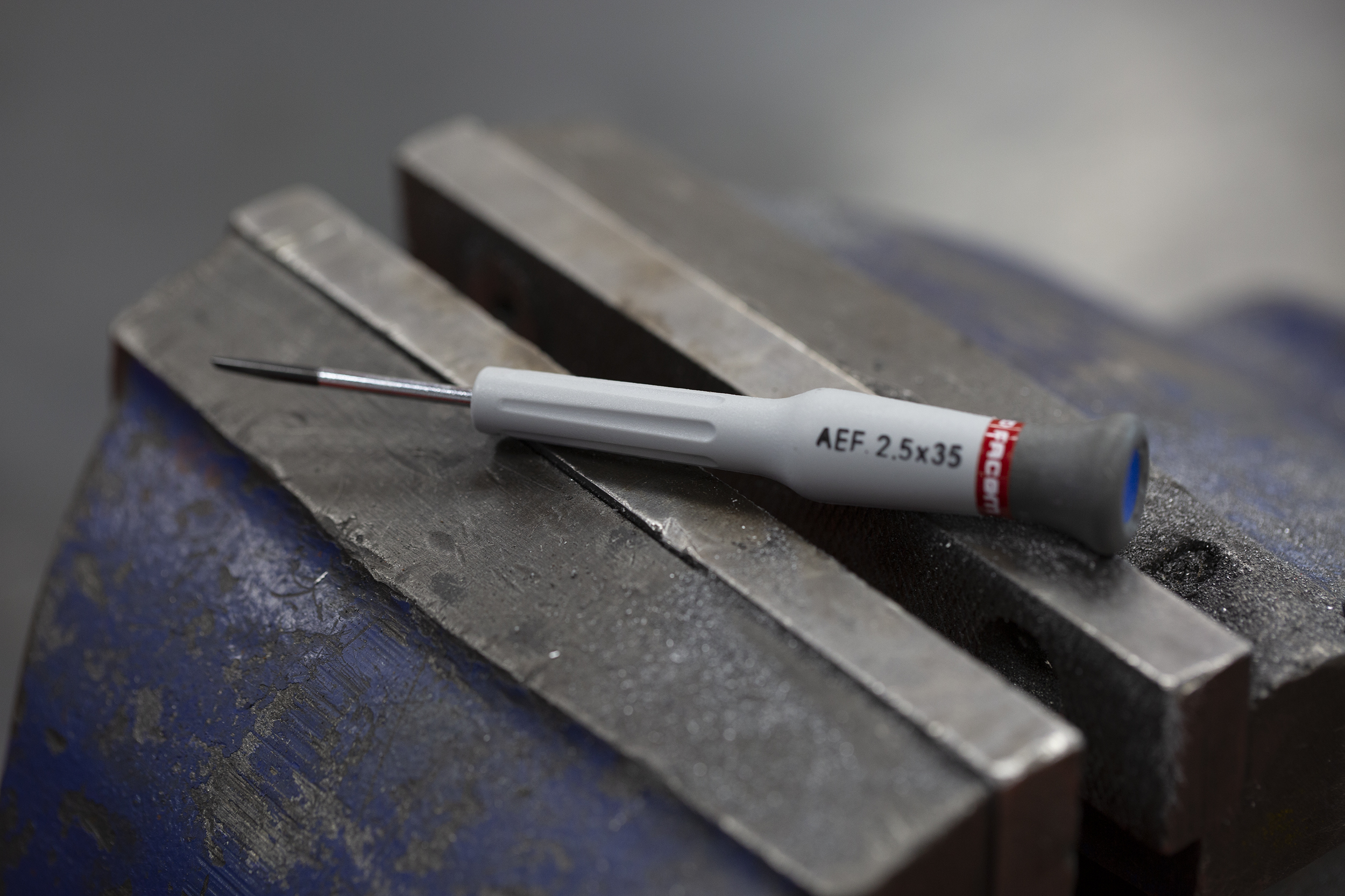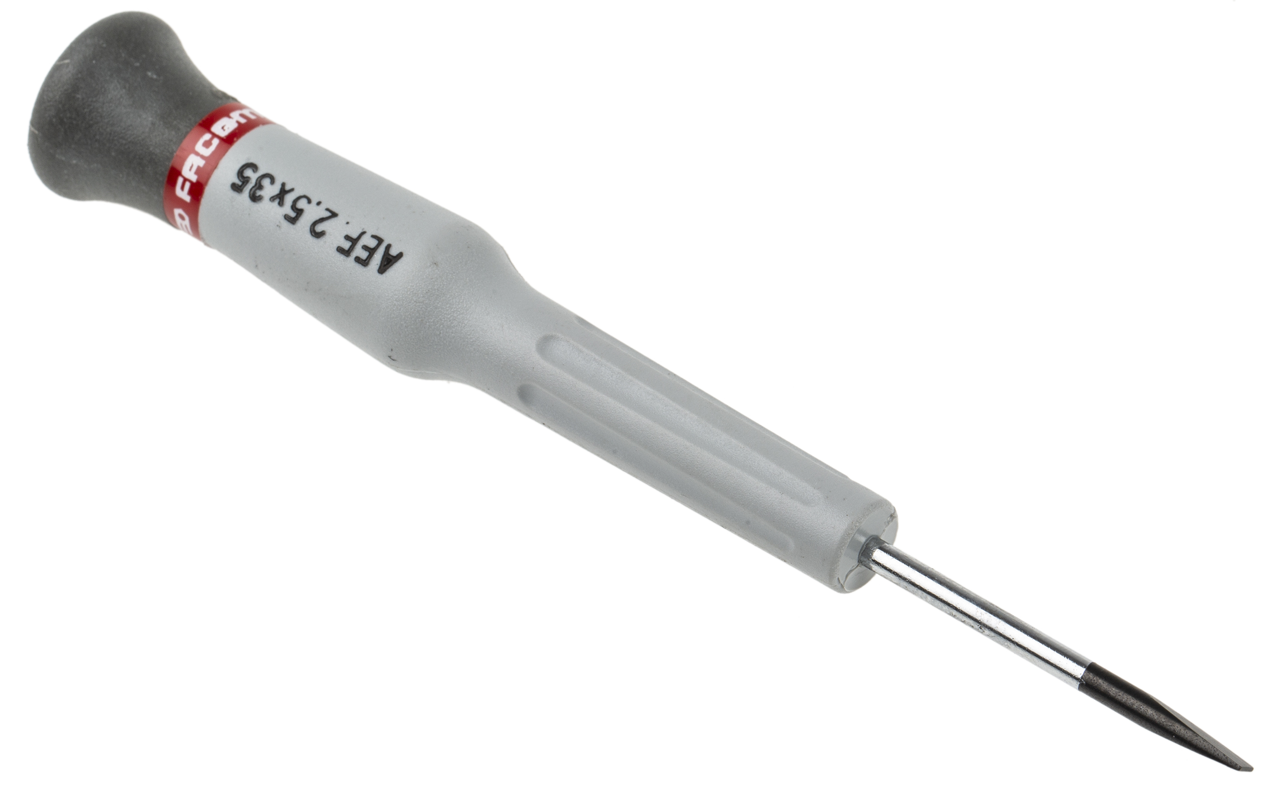 This is Flat Precision Screwdriver 2.5 mm Tip manufactured by Facom. The manufacturer part number is AEF.2.5X35. This standard screwdriver screwdriver offers extreme comfort and a non-slip grip. The tip is 2,5 mm in size. Its comfortable handle is manufactured from durable bi-material material. In addition, it has a chrome blade finish . The blade has a length of 35 mm. It has an overall length of 117 mm. The built-in exquisite tip is a slotted tip.