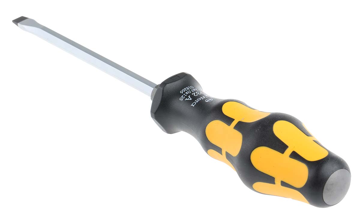 This is Flat Chisel Driver Screwdriver 7 x 1.2 mm Tip manufactured by Wera. The manufacturer part number is 05018266001. The blade has a length of 125 mm. This standard screwdriver screwdriver offers extreme comfort and a non-slip grip. The tip is 7 x 1.2 mm in size. The built-in exquisite tip is a slotted tip. In addition, it has a matt nickel blade finish .