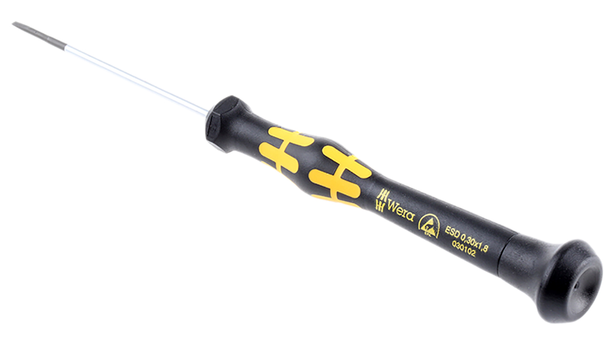 This is Flat Precision Screwdriver 1.8 x 0.30 mm Tip manufactured by Wera. The manufacturer part number is 05030102001. This precision screwdriver screwdriver offers extreme comfort and a non-slip grip. The tip is 1.8 x 0.30 mm in size. ESD Safety - yes. Its comfortable handle is manufactured from durable bi-material material. In addition, it has a chrome blade finish . The blade has a length of 60 mm. It has an overall length of 157 mm. The built-in exquisite tip is a slotted tip.