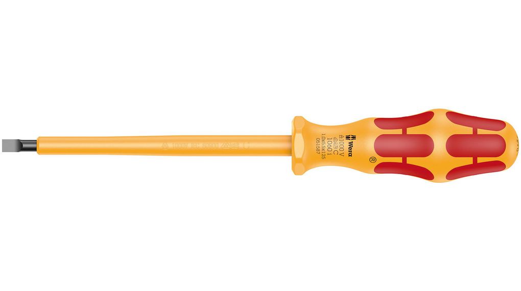 This is Slotted Insulated Screwdriver VDE/1000V manufactured by Wera. The manufacturer part number is 05051587001. VDE/1000V Approval Options - yes. This insulated screwdriver screwdriver offers extreme comfort and a non-slip grip. The built-in exquisite tip is a slotted tip.