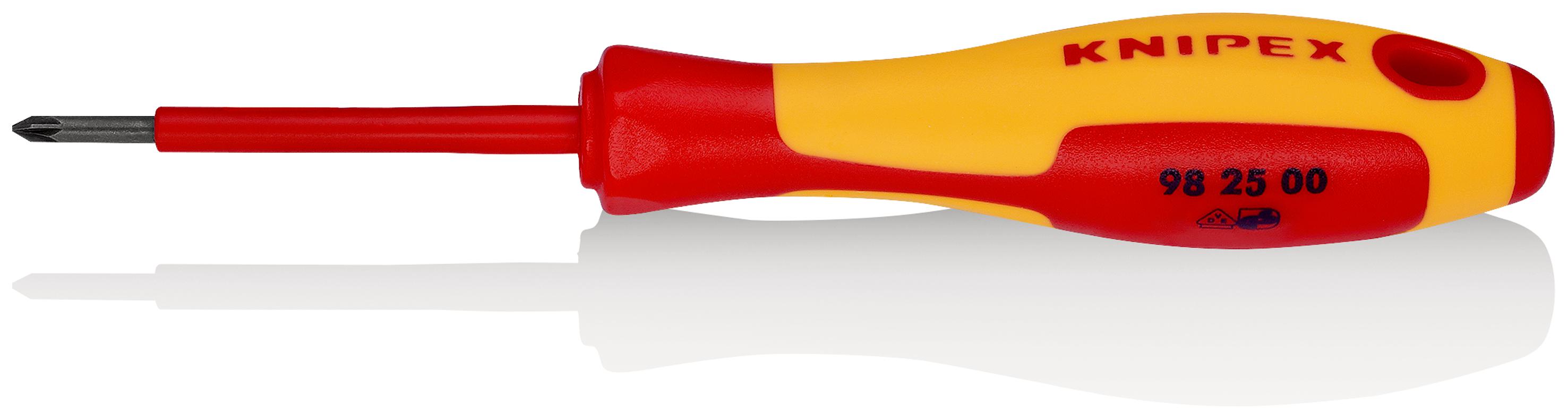 This is Pozidriv Screwdriver VDE/1000V manufactured by Knipex. The manufacturer part number is 98 25 00. VDE/1000V Approval Options - yes. This insulated screwdriver screwdriver offers extreme comfort and a non-slip grip. The tip is pz0 in size. Its comfortable handle is manufactured from durable bi-material material. ESD Safety - no. It has a non sparking nature no . In addition, it has a black blade finish . The blade has a length of 60 mm. It is height safe yes . Insulation Option: 1000v. It has an overall length of 162 mm. The built-in exquisite tip is a pozidriv tip. In addition, its blade is made up of high grade steel material .