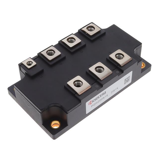 This is manufactured by KYOCERA AVX. The manufacturer part number is PGH200N16. It is assigned with possible HTSUS value of 8541.30.0080. The product is rohs3 compliant. It has an off state voltage of 1.6 kv. While the maximum voltage - gate trigger includes 3 v. The product has -40°c ~ 150°c (tj) operating temperature range. Moreover, the product comes in module. The maximum hold current is 100 ma. It has a bridge, 3-phase - scrs/diodes structure. It is shipped in bulk package . Its typical moisture sensitivity level is 1 (unlimited). The maximum gate triggering current is 150 ma. It has a long 18 weeks standard lead time. Non rep. current with 50, 60Hz surge included 4000a @ 50hz. The product is available in chassis mount configuration. Maximum on state current of 200 a. It consists of 1 scr, 6 diodes . The product is designated with the ear99 code number.