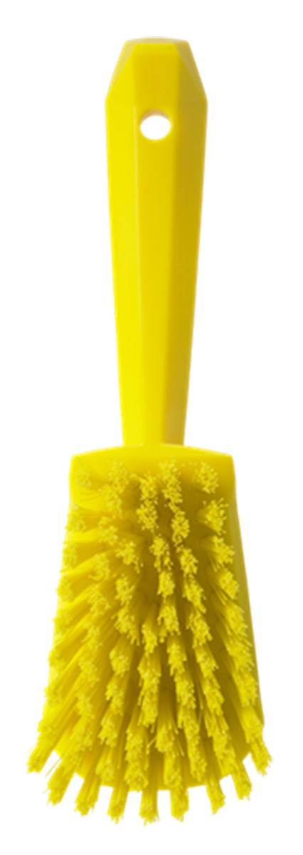 This is Short Handle Churn Brush 270mm Stiff manufactured by Vikan. The manufacturer part number is 41926. The product has a high-quality washing brush type brush . The product is food processing safe yes . Its bristle is 36mm in length . It has a decent yellow colour. The overall width of the product is about 270mm . Applications Information involves multipurpose cleaning. The product's depth is about 70mm . Its bristle is made using high-quality polyester material . It is hard .