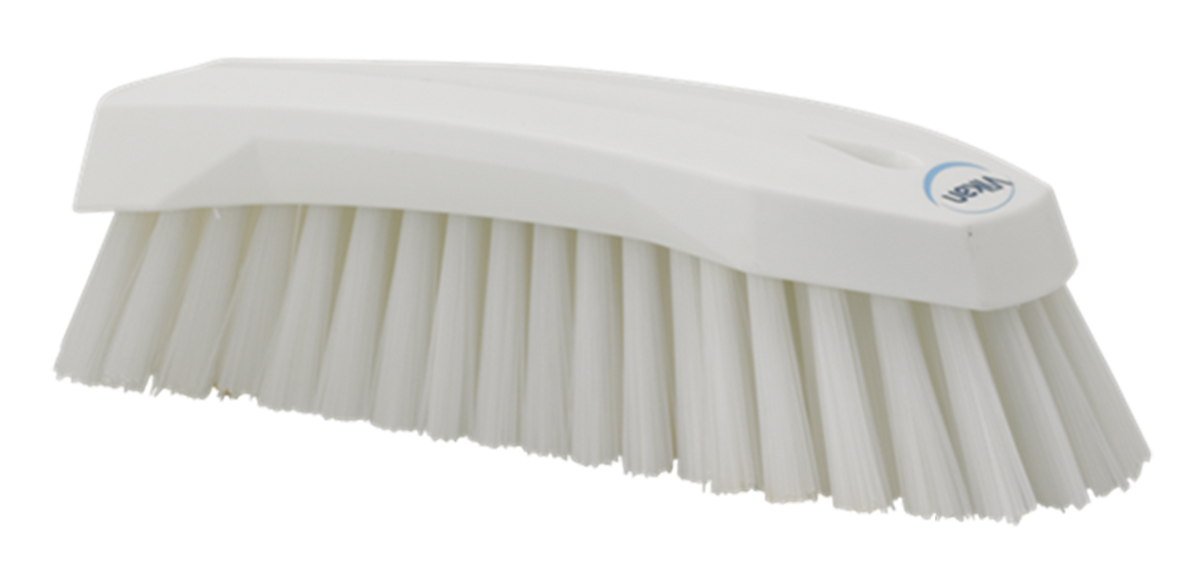 This is Hand Brush Large 200mm Stiff White manufactured by Vikan. The manufacturer part number is 38905. The product has a high-quality hand brush type brush . The product is food processing safe yes . Its bristle is 36mm in length . It has a decent white colour. The overall width of the product is about 200mm . Applications Information involves multipurpose cleaning. The product's depth is about 70mm . Its bristle is made using high-quality polyester material . It is hard .
