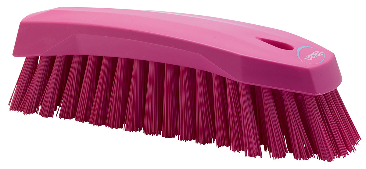 This is Hand Brush L 200 mm Hard Pink manufactured by Vikan. The manufacturer part number is 38901. The product has a high-quality hand brush type brush . The product is food processing safe yes . Its bristle is 36mm in length . It has a decent pink colour. The overall width of the product is about 70mm . Applications Information involves multipurpose cleaning. The product's depth is about 200mm . Its bristle is made using high-quality pet material . It is hard .