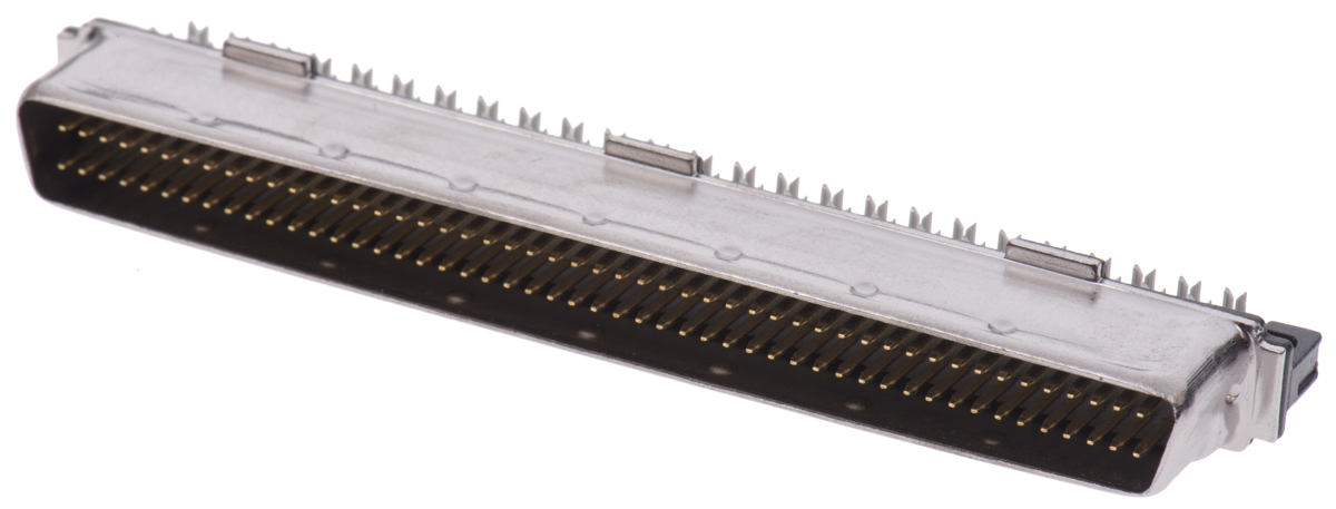 This is Amplimite .050 III Series Male 100 Pin Straight Cable Mount SCSI Connector 1.27mm Pitch Crimp manufactured by TE Connectivity. The manufacturer part number is 1-5750913-9. The product also features robust thermoplastic housing material. The product amplimite .050 iii, is a highly preferred choice for users. The product has a current rating of 1a. The high-quality gold over nickel is used as contact plating material. The product is available in cable mount configuration. Moreover, the product has a nominal 30 v ac voltage rating. In addition, male is the available "Gender" of the product. It has straight body orientation. It allows crimp termination method. Its accurate length is 71.86mm. In addition, it has a quick latch type latch . Furthermore, the product is 14.94mm wide. The product comes in 9.47mm depth. Moreover, the product is 1.27mm. The product contains 100 contacts. It has a maximum operating temperature of +105°c. Whereas, the minimum operating temperature of the product is -55°c. The product is made from sturdy phosphor bronze materials.