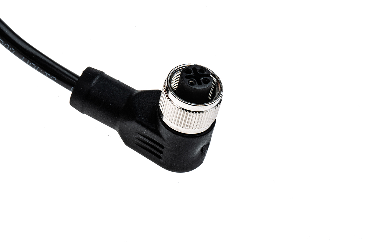 This is Cable assembly with a 4 Pole Angled M12 Connector and an Unterminated End 4 A 250 V 5m Cable manufactured by RS Pro. The manufacturer part number is 877-1047. Features 22 awg - American Wire Gauge. The product has a current rating of 4 a. The product consists of 4 cores. Its outer diameter is 4.5mm. The sheath is constructed from durable and adorable pur material. Moreover, this cable has a multicore shape. It is IP rated with ip67. Moreover, the product is unshielded . The product has -25 → +75 °c of operating temperature range. It has a maximum operating temperature of +75°c. Moreover, the product has a nominal 250 v voltage rating. The connector 1 has a right angle orientation. This connector 1 is a female. Its accurate length is 5m. On the other hand, the gender of connector 1's housing is female. There are 4 contacts on connector 1. The sheath has an adorable black colour. The product has 0.34 mm² cross section area. Whereas, the minimum operating temperature of the product is -25°c. While the Connector 2 is unterminated. Connector 1 is m12.