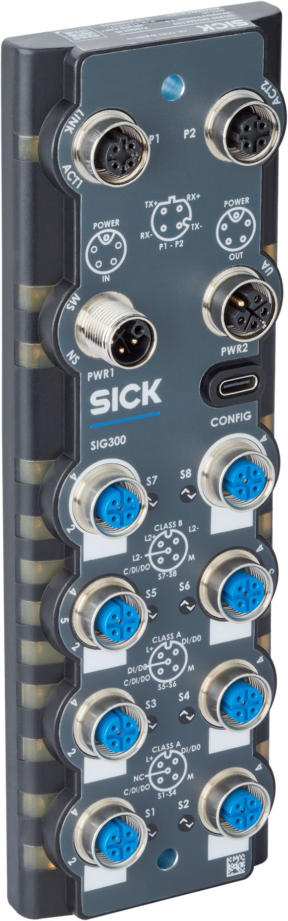 This is SIG300 Series I/O module M12 5 way 8 port manufactured by SICK. The manufacturer part number is SIG300-0A0GAA100. It is created with ethercat type protocol . It comprises 5 ways. The product has a horizontal orientation. The typical product's weight is 460g. It is IP rated with ip67. It is tailored with io-link communication protocol . The product sig300, is a highly preferred choice for users. The product also features robust galvansied steel, polyamide housing material. This product features 8 number of ports. The connector has m12 size. It has an operating voltage about 24v dc . The product's typical temperature range incudes -40 °c → 55 °c.