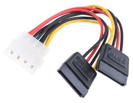 This is Power Serial Cable Assembly Male to Female 4-Pin Molex to SATA x2 manufactured by RS Pro. The manufacturer part number is 739-3744. While the connector B is sata x2. It is a typical power cable. The connector A is 4-pin molex connector.