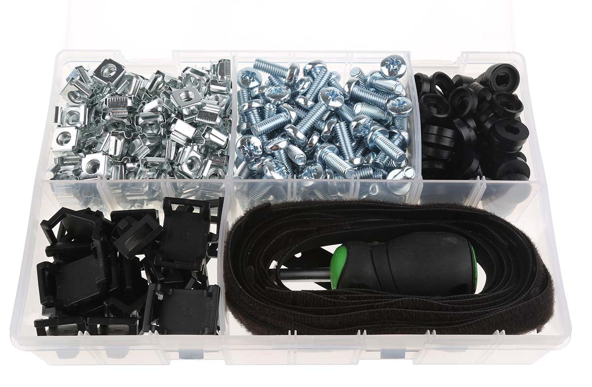 The RS Pro 768‑2621 cage nut kit is designed for robust and flexible installation of 19‑inch rack‑mount equipment. Supplied as a kit with 30 M6 cage nuts, matching cup washers, Pozi pan screws, hook‑and‑loop ties, and an insertion tool, it offers everything needed to outfit server racks or cabinets. Its components are RoHS‑compliant and suited for professional data center and networking setups.