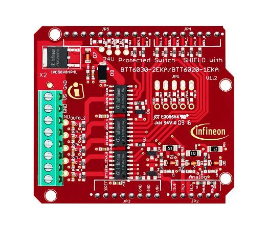 This is Evaluation Board for BTT6020-1EKA BTT6030-2EKA Evaluation Board for Arduino manufactured by Infineon. The manufacturer part number is 24VSHIELDBTT6030TOBO1. On the other hand, the arduino is the device core. This product use microcontroller technology. This kit is known as 24v protected switch shield, consists of highly versatile and user-desired tools. It is classified as a/an evaluation board .