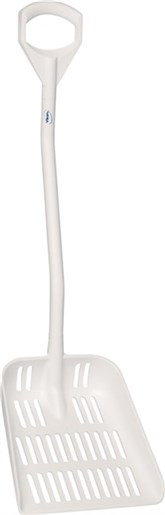 This is 380 x 340 x 90 mm Ergonomic Shovel manufactured by Vikan. The manufacturer part number is 56035. The product is food processing safe yes . It has a decent white colour. It is 1145mm long. The blade has a length of 380mm. shovel is a versatile product designed to provide user-defined applications. Its sub type is ergonomic shovel . In addition, its blade is made up of polypropylene, anodised aluminium material .