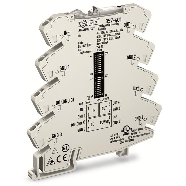 This is manufactured by WAGO Corporation. The manufacturer part number is 857-401. The product is rohs3 compliant. While the additional input range is 0 ~ 100kohm. Moreover, it has spring terminal terminal style. The product has -25°c ~ 70°c operating temperature range. It carries current, voltage input type. It comes in isolation amplifier configuration. Has a 0 ~ 20ma, 0 ~ 10v (configurable) of output range. In addition, it is reach affected. Furthermore, it has acurrent, voltage output. The wago corporation's product offers user-desired applications. Features a 2500v (test) isolation. Its typical moisture sensitivity level is not applicable. It has a long 12 weeks standard lead time. The product is available in din rail configuration. It features a ±20ma, 0 ~ 30v (configurable) input range (current, voltage). The product 857, is a highly preferred choice for users. In addition, bag is the available packaging type of the product. It has optimum voltage supply of 24vdc.