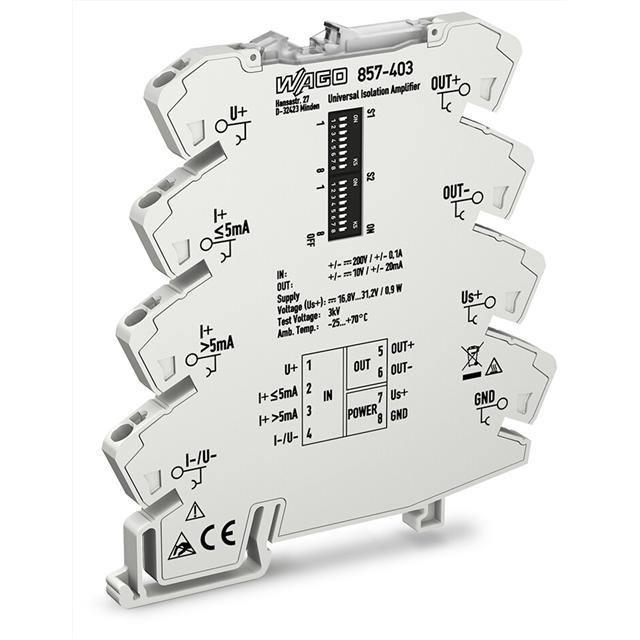 This is manufactured by WAGO Corporation. The manufacturer part number is 857-403. It is assigned with possible HTSUS value of 8543.70.9810. The product is rohs3 compliant. While the additional input range is 0 ~ 1mohm. Moreover, it has spring terminal terminal style. The product has -25°c ~ 70°c operating temperature range. It carries current, voltage input type. It comes in isolation amplifier configuration. Has a ±20ma, ±10v (configurable) of output range. Furthermore, it has acurrent, voltage output. The wago corporation's product offers user-desired applications. Features a 2500v (test) isolation. Its typical moisture sensitivity level is not applicable. It has a long 12 weeks standard lead time. The product is available in din rail configuration. It features a ±100ma, ±500v (configurable) input range (current, voltage). The product 857, is a highly preferred choice for users. In addition, bulk is the available packaging type of the product. It has optimum voltage supply of 24vdc. The product is designated with the ear99 code number.