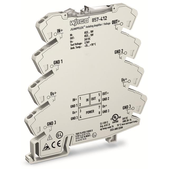 This is manufactured by WAGO Corporation. The manufacturer part number is 857-412. It is assigned with possible HTSUS value of 8543.70.9810. The product is rohs3 compliant. While the additional input range is 0 ~ 100kohm. Moreover, it has spring terminal terminal style. The product has -25°c ~ 70°c operating temperature range. It carries voltage input type. It comes in isolation amplifier configuration. Has a 0 ~ 10v (configurable) of output range. In addition, it is reach affected. Furthermore, it has avoltage output. It is shipped in bag package . Features a 2500v (test) isolation. Its typical moisture sensitivity level is not applicable. It has a long 12 weeks standard lead time. The product is available in din rail configuration. It features a 0 ~ 10v (configurable) input range (current, voltage). The product 857, is a highly preferred choice for users. It has optimum voltage supply of 24vdc. The product is designated with the ear99 code number.