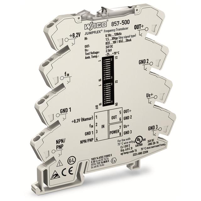 This is manufactured by WAGO Corporation. The manufacturer part number is 857-500. It is assigned with possible HTSUS value of 8543.70.9860. The product is rohs3 compliant. While the additional input range is 0.1 ~ 120khz, 0 ~ 10kohms. Moreover, it has spring terminal terminal style. The product has -25°c ~ 70°c operating temperature range. It carries frequency input type. It comes in signal conditioner configuration. Has a 0 ~ 20ma, 0 ~ 10v (configurable) of output range. In addition, it is reach affected. Furthermore, it has acurrent, voltage output. It is shipped in bag package . Features a 2500v (test) isolation. Its typical moisture sensitivity level is not applicable. It has a long 12 weeks standard lead time. The product is available in din rail configuration. The product 857, is a highly preferred choice for users. It has optimum voltage supply of 24vdc. The product is designated with the ear99 code number.