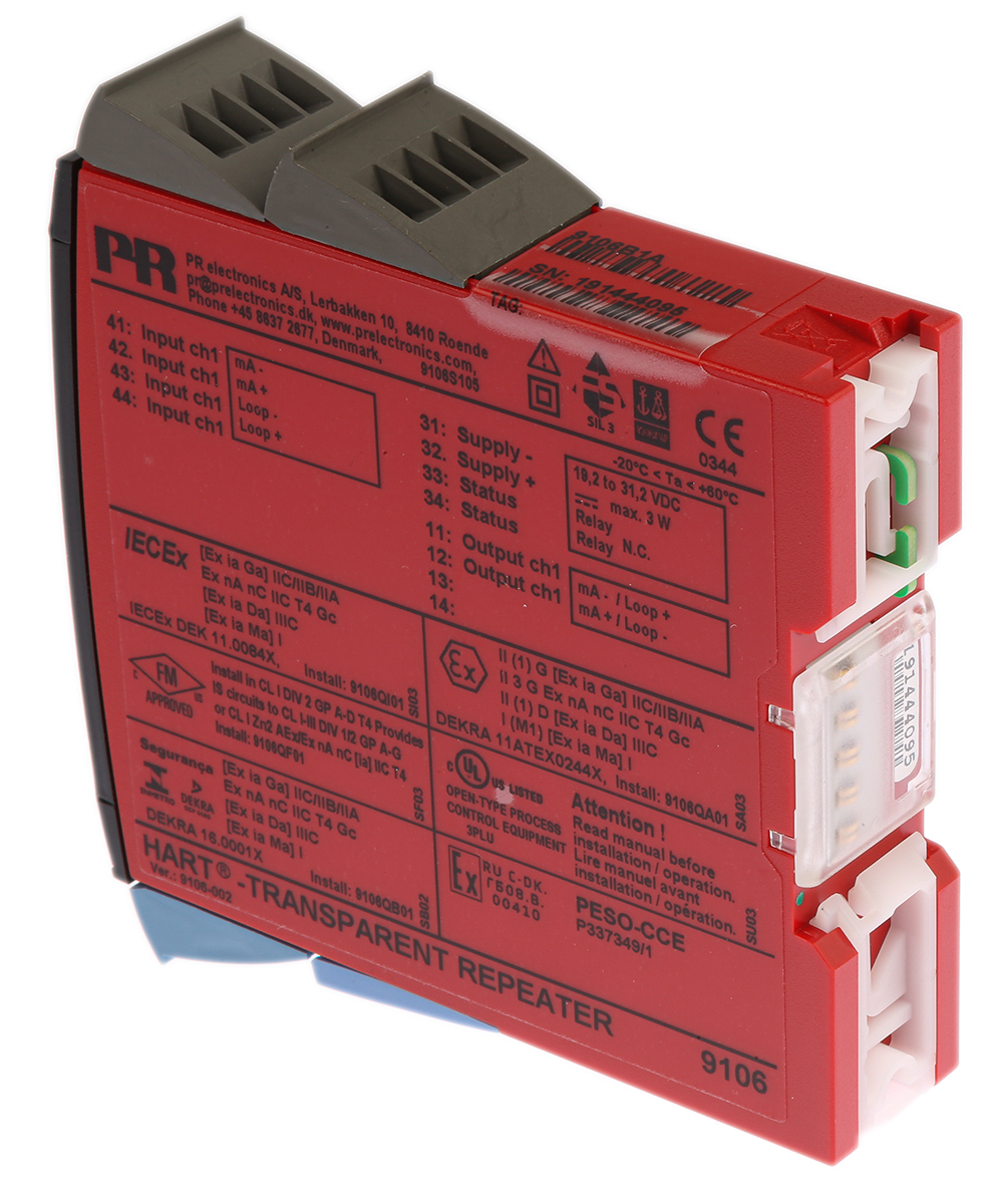 This is 1 Channel Isolation Barrier with Analogue Output 250 V ac max manufactured by PR Electronics. The manufacturer part number is 9106B1A. The output signal is a kind of current, relay. The product has -20 → +60°c of operating temperature range. The product 9100, is a highly preferred choice for users. It has a/an hart transparent repeater type module . The product is certified with atex hazardous area certification. The input signal is a kind of current signal. Features 19.2 → 31.2v dc supply voltage. It has a maximum operating temperature of +60°c. Whereas, the minimum operating temperature of the product is -20°c.