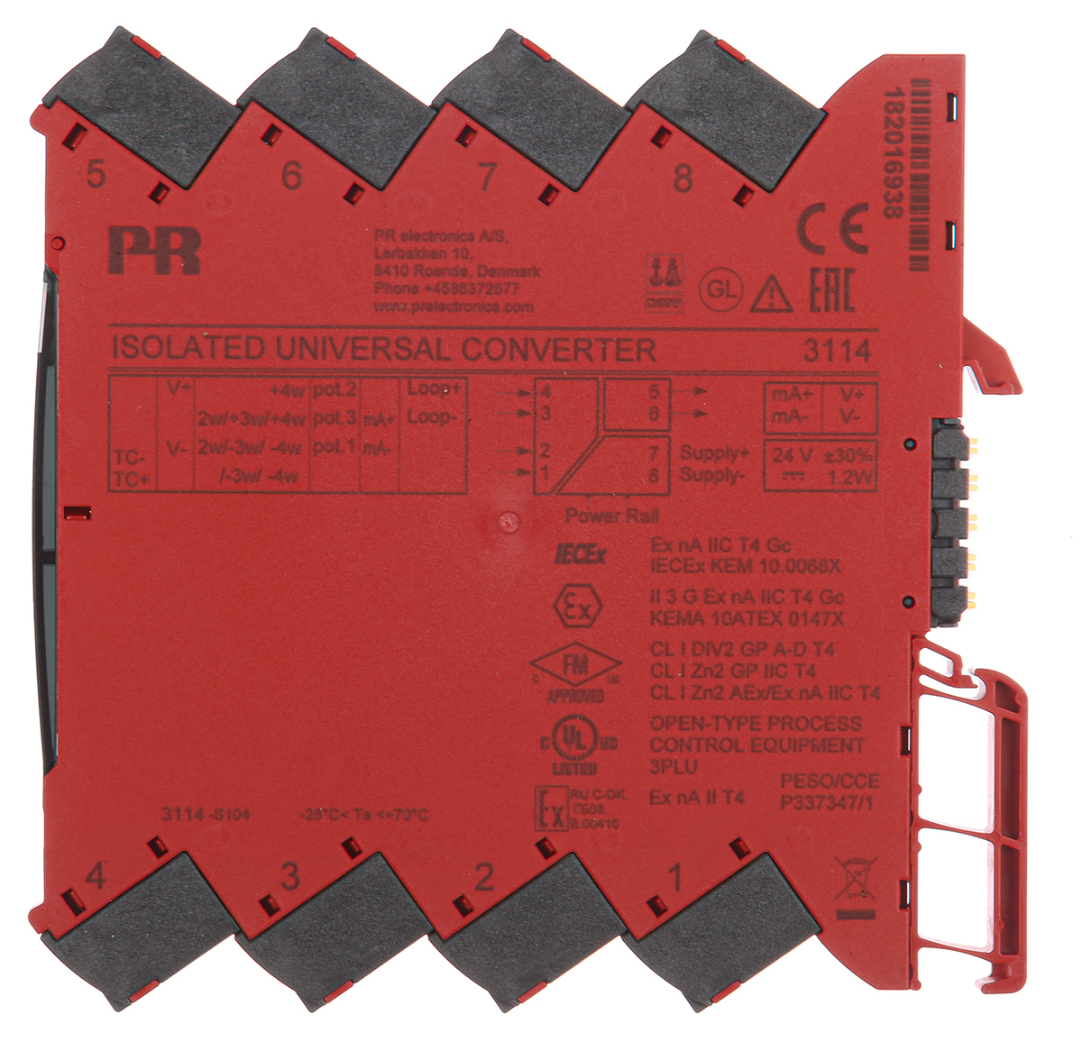 This is Analogue to Current Signal Conditioner ATEX 0 → 12 V dc 0 → 20 mA Input manufactured by PR Electronics. The manufacturer part number is 3114. The product is certified with atex hazardous area certification. The output signal is a kind of current, voltage. The product is available in din rail mount configuration. The product has -25 → +70°c of operating temperature range. Has a 0 → 10 v dc, 0 → 20ma of output range. The product 3100, is a highly preferred choice for users. It has a/an universal signal converter type module . Typical input range of 0 → 12 v dc, 0 → 20ma. The input signal is a kind of universal signal. Features 16.8 → 31.2v dc supply voltage. It has a maximum operating temperature of +70°c. Whereas, the minimum operating temperature of the product is -25°c.