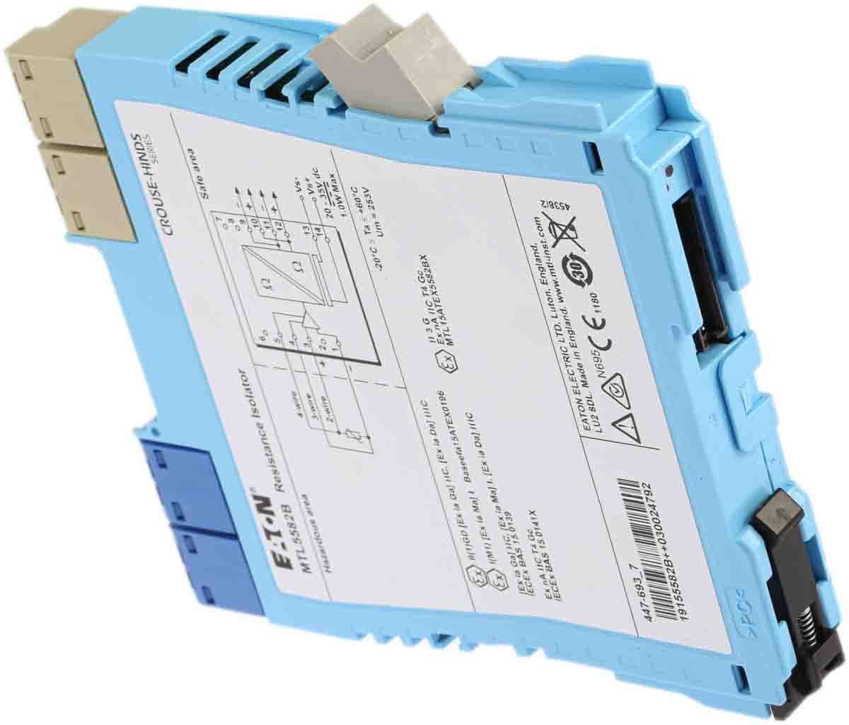 This is MTL Series Signal Conditioner 20 → 35V dc RTD Input Resistance Output manufactured by Eaton. The manufacturer part number is MTL5582B. The output signal is a kind of resistance. The product is available in din rail mount configuration. Has a 10 ω → 400ω of output range. The product mtl, is a highly preferred choice for users. It has a/an resistance isolator to repeat rtd signals type module . Typical input range of 10 ω → 400ω. The input signal is a kind of rtd signal. Features 20 → 35v dc supply voltage. The product features screw termination style.