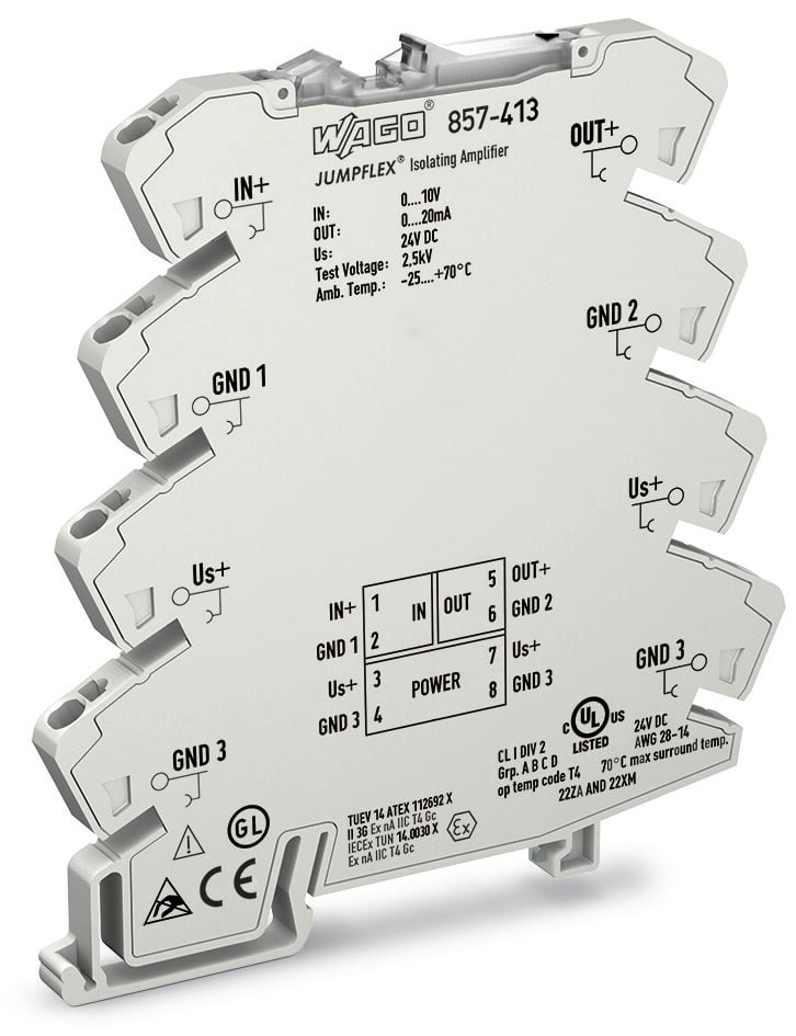 The WAGO Isolation amplifier is a 6 mm module width device designed for specific signal conditioning applications. It takes a voltage input signal and provides a current output signal. It operates on a supply voltage of 24 VDC. The amplifier is pre configured and serves as a signal conditioner, which means it converts, amplifies, filters, and electrically isolates analogue standard signals. RoHS compliant IP20 degree of protection 3 way electrical isolation