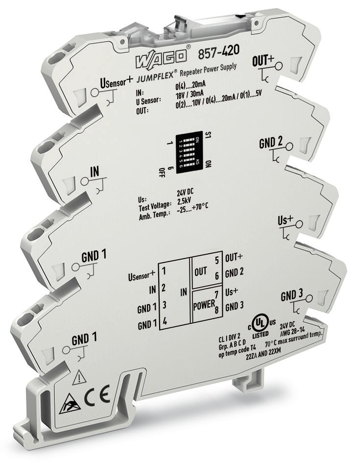 This is 857 Series Signal Conditioner Current Input Current Voltage Output 24V dc Supply manufactured by WAGO. The manufacturer part number is 857-420. The output signal is a kind of current, voltage. The product 857, is a highly preferred choice for users. It has a/an isolating amplifier type module . Typical input range of 0 - 20ma. The input signal is a kind of current signal. Features 24v dc supply voltage.
