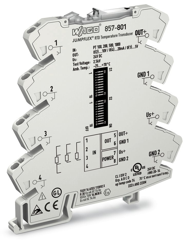 This is 857 Series Signal Conditioner Temperature Input Current Voltage Output 24V dc Supply manufactured by WAGO. The manufacturer part number is 857-801. The output signal is a kind of current, voltage. The product 857, is a highly preferred choice for users. It has a/an temperature sensor signal converter type module . The input signal is a kind of temperature signal. Features 24v dc supply voltage.