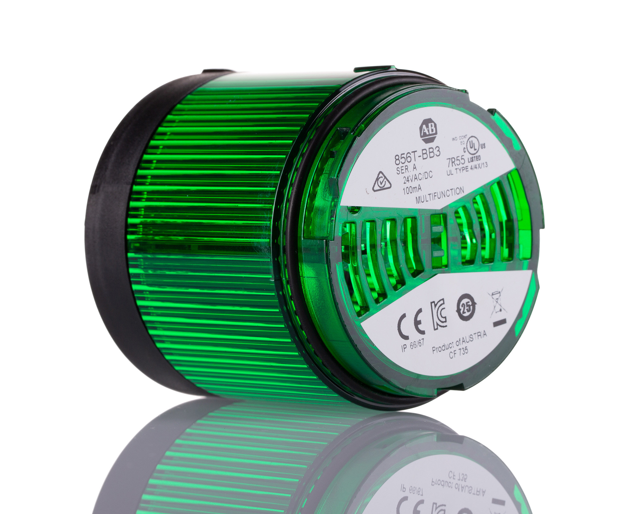 This is 70 mm Light Modules Black Housing Color manufactured by Allen Bradley. The manufacturer part number is 856T-BB3. The housing has an adorable black colour. The lens has an adorable green colour. The product is integrated with a led bulb. It is IP rated with ip66, ip67. The product 856t, is a highly preferred choice for users. It is multifunctional yes . In addition, the height is 77mm. This product harbours ac, dc current. The product has +70°c maximum temperature. It includes a lamp yes . While its minimum temperature is -30°c. This [Component type] component is indispensable for product's effective functionality. The product provides a flashing, steady, strobe lighting effect. The base diameter includes 70mm. Features 24 v ac/dc supply voltage.
