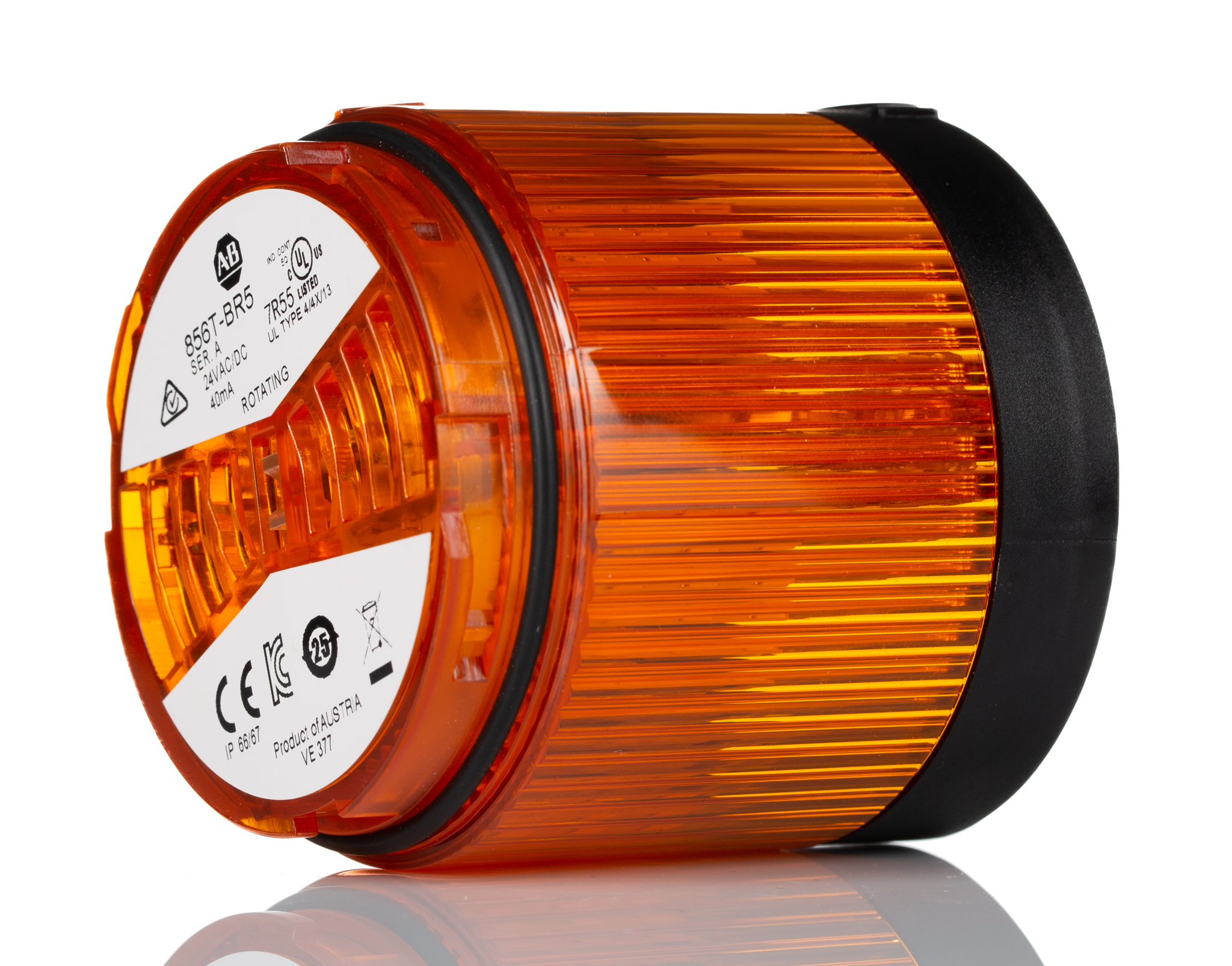 This is 70 mm Light Modules Black Housing Color manufactured by Allen Bradley. The manufacturer part number is 856T-BR5. The housing has an adorable black colour. The lens has an adorable amber colour. The product is integrated with a led bulb. It is IP rated with ip66, ip67. The product 856t, is a highly preferred choice for users. It is multifunctional no . In addition, the height is 80mm. This product harbours ac, dc current. The product has +70°c maximum temperature. It includes a lamp yes . While its minimum temperature is -30°c. This [Component type] component is indispensable for product's effective functionality. The product provides a rotating lighting effect. The base diameter includes 70mm. Features 24 v ac/dc supply voltage.