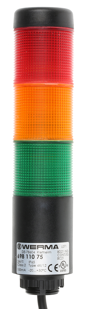 Werma Beacon Tower The Werma beacon tower is suited to applications on small machines and equipment with limited spaces. It has coloured LEDs, which provides maximum colour intensity making it particularly effective in lower-light environments. In bright sunlight however it can be difficult to see the difference between a coloured lens and an illuminated coloured lens. This is where the clear lens signal tower comes into its own as it is only coloured when in the ON position, therefore ensuring it is not mistaken as being illuminated when it is in the OFF. Features and Benefits Pre-assembled signal tower with maximum of 5 tiers LED permanent light Maintenance free LEDs Number of light elements are 3 Lens Colour is green, red and yellow LED bulb Steady light effect Base mount Height is 174.5mm Base diameter is 37.5mm 200mm cable with M12 connector Supply Voltage of 24VAC/DC Current Consumption of 150mA Housing colour is black Operating temperature ranges between -20°C and 50°C Certifications ANSI/ESD S20.20:2014 BS EN 61340-5-1:2007