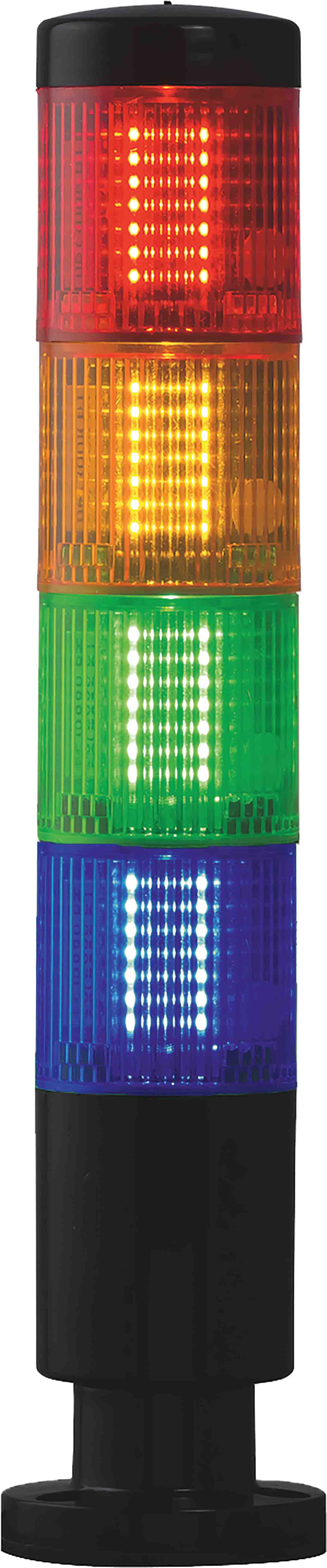 This is LED Signal Tower 4 Light Elements 24 V manufactured by RS PRO. The manufacturer part number is 220-5037. The housing has an adorable black colour. The lens has an adorable red/green/amber/blue colour. The product is integrated with a led bulb. It is IP rated with ip65. It includes a no sounder component sounder component . While its minimum temperature is -30°c. In addition, the height is 165mm. The product is available in screw mount style. It has about 4 light elements . The product has +50°c maximum temperature. Features 24 v supply voltage. The product provides a steady lighting effect. The base diameter includes 45mm.