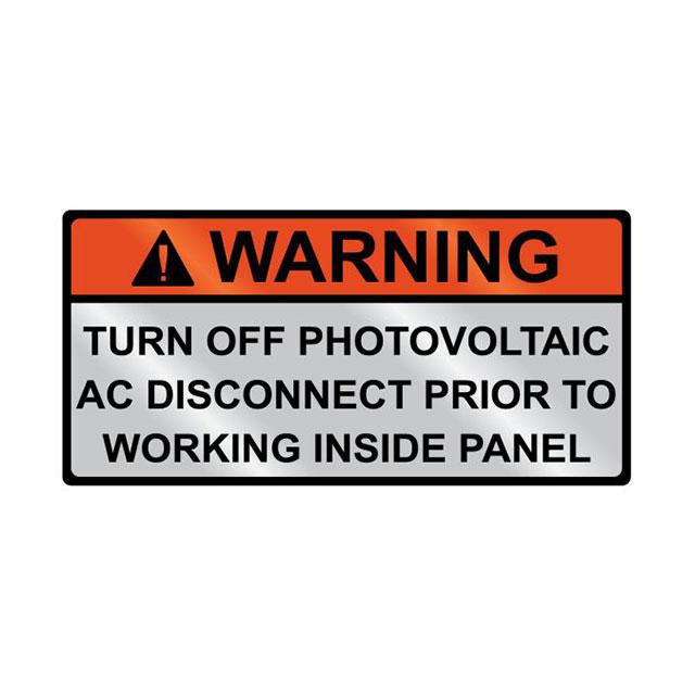This is manufactured by HellermannTyton. The manufacturer part number is 596-00832. Label with a size of 3.75" l x 2.00" w (95.3mm x 50.8mm). It is assigned with possible HTSUS value of 8310.00.0000. It is shipped in bulk package . It has a classic black legend, orange and white background colour. The product is made from highly stable and reliable aluminum. Its typical moisture sensitivity level is not applicable. A bespoke label is a warning. turn off photovoltaic ac disconnect prior to working inside panel label. The product is suitable for use with warning. It has a long 4 weeks standard lead time. Moreover, it corresponds to 596-00, a base product number of the product. The product is designated with the ear99 code number.