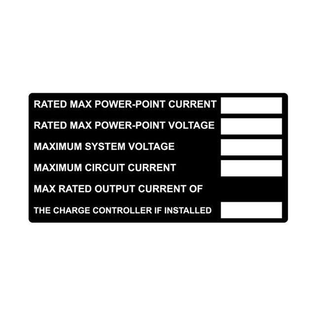 This is manufactured by HellermannTyton. The manufacturer part number is 596-00839. Label with a size of 4.00" l x 2.00" w (101.6mm x 50.8mm). It is assigned with possible HTSUS value of 8310.00.0000. It is shipped in bulk package . It has a classic white legend, black background colour. The product is made from highly stable and reliable aluminum. Its typical moisture sensitivity level is not applicable. A bespoke label is a rated max power- point current. rated max power-point voltage. maximum circuit current. max rated output current of the char... label. The product is suitable for use with notice. It has a long 4 weeks standard lead time. Moreover, it corresponds to 596-00, a base product number of the product. The product is designated with the ear99 code number.