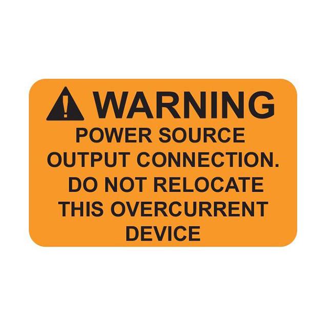 This is manufactured by HellermannTyton. The manufacturer part number is 596-00917. Label with a size of 2.00" l x 1.25" w (50.8mm x 31.8mm). It is assigned with possible HTSUS value of 8310.00.0000. It is shipped in bulk package . It has a classic black legend, orange background colour. The product is made from highly stable and reliable aluminum. Its typical moisture sensitivity level is not applicable. A bespoke label is a warning. power source output connection. do not relocate this overcurrent device label. The product is suitable for use with warning. It has a long 4 weeks standard lead time. Moreover, it corresponds to 596-00, a base product number of the product. The product is designated with the ear99 code number.