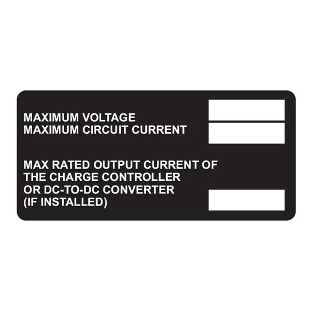 This is manufactured by HellermannTyton. The manufacturer part number is 596-00918. Label with a size of 3.75" l x 1.75" w (95.3mm x 44.5mm). It is assigned with possible HTSUS value of 8310.00.0000. It has a classic white legend, black background colour. The product is made from highly stable and reliable aluminum. Its typical moisture sensitivity level is not applicable. In addition, bulk is the available packaging type of the product. A bespoke label is a maximum voltage. maximum circuit current. max rated output current of the charge controller or dc-to-dc converter (if instal... label. The product is suitable for use with notice. It has a long 4 weeks standard lead time. The hellermanntyton's product offers user-desired applications. Moreover, it corresponds to 596-00, a base product number of the product. The product is designated with the ear99 code number.