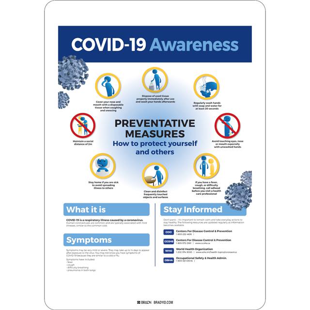 This is manufactured by Brady Corporation. The manufacturer part number is 170280. Label with a size of 10.00" l x 14.00" w (254.0mm x 355.6mm). The product is not applicable. It is assigned with possible HTSUS value of 3926.90.9989. It has a classic black legend, white background colour. The product b-401, is a highly preferred choice for users. The product is made from highly stable and reliable plastic. Its typical moisture sensitivity level is not applicable. In addition, bulk is the available packaging type of the product. A bespoke label is a covid-19 awareness. preventative measures. how to protect yourself and others. label. The product is suitable for use with notice. The brady corporation's product offers user-desired applications. The product is designated with the ear99 code number.