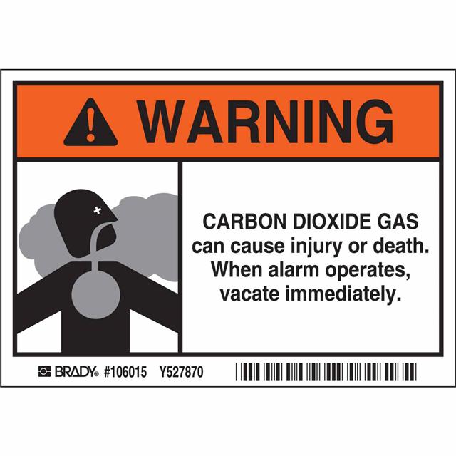 This is manufactured by Brady Corporation. The manufacturer part number is 106015. Label with a size of 5.00" l x 3.50" w (127.0mm x 88.9mm). The product is not applicable. It is assigned with possible HTSUS value of 3926.90.9985. It is shipped in bulk package . It has a classic black, gray and orange legend, white background colour. The product brady®, is a highly preferred choice for users. The product is made from highly stable and reliable polyester. In addition, it is reach unaffected. Its typical moisture sensitivity level is not applicable. A bespoke label is a warning. carbon dioxide gas can cause injury or death. when alarm operates, vacate immediately label. The product is suitable for use with warning. It has a long 4 weeks standard lead time. The product is designated with the ear99 code number.