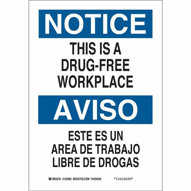 This is manufactured by Brady Corporation. The manufacturer part number is 125072. Label with a size of 14.00" l x 10.00" w (355.6mm x 254.0mm). The product is rohs3 compliant. It is assigned with possible HTSUS value of 3926.90.9985. It is shipped in bulk package . It has a classic black and blue legend, white background colour. The product brady®, is a highly preferred choice for users. The product is made from highly stable and reliable polyester. In addition, it is reach unaffected. Its typical moisture sensitivity level is not applicable. A bespoke label is a notice/aviso. this is a drug-free workplace/este es un area de trabajo libre de drogas label. It has a long 4 weeks standard lead time. The product is designated with the ear99 code number.
