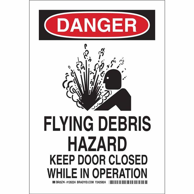 This is manufactured by Brady Corporation. The manufacturer part number is 126224. Label with a size of 10.00" l x 7.00" w (254.0mm x 177.8mm). The product is rohs3 compliant. It is assigned with possible HTSUS value of 3926.90.9985. It is shipped in bulk package . It has a classic black and red legend, white background colour. The product brady®, is a highly preferred choice for users. The product is made from highly stable and reliable polyester. In addition, it is reach unaffected. Its typical moisture sensitivity level is not applicable. A bespoke label is a danger. flying debris hazard keep door closed while in operation label. It has a long 4 weeks standard lead time. The product is designated with the ear99 code number.