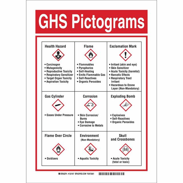 This is manufactured by Brady Corporation. The manufacturer part number is 133170. Label with a size of 14.00" l x 10.00" w (355.6mm x 254.0mm). The product is rohs3 compliant. It is assigned with possible HTSUS value of 3926.90.9985. It is shipped in bulk package . It has a classic black and red legend, white background colour. The product brady®, is a highly preferred choice for users. The product is made from highly stable and reliable polyester. In addition, it is reach unaffected. Its typical moisture sensitivity level is not applicable. A bespoke label is a ghs pictograms label. The product is suitable for use with notice. The product is designated with the ear99 code number.