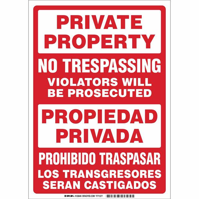 This is manufactured by Brady Corporation. The manufacturer part number is 103849. Label with a size of 14.00" l x 10.00" w (355.6mm x 254.0mm). The product is rohs3 compliant. It is assigned with possible HTSUS value of 3926.90.9985. It is shipped in bulk package . It has a classic red legend, white background colour. The product brady®, is a highly preferred choice for users. The product is made from highly stable and reliable polyester. In addition, it is reach unaffected. Its typical moisture sensitivity level is not applicable. A bespoke label is a private property/propiedad privada. no trespassing violators will be prosecuted/prohibido traspasar los transgresores deran ca… label. The product is suitable for use with warning. It has a long 4 weeks standard lead time. The product is designated with the ear99 code number.