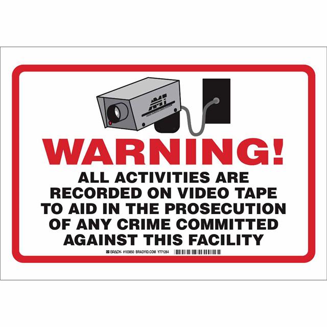 This is manufactured by Brady Corporation. The manufacturer part number is 103850. Label with a size of 14.00" l x 10.00" w (355.6mm x 254.0mm). The product is rohs3 compliant. It is assigned with possible HTSUS value of 3926.90.9989. It has a classic black and red legend, white background colour. The product brady®, is a highly preferred choice for users. The product is made from highly stable and reliable polyester. In addition, it is reach unaffected. Its typical moisture sensitivity level is not applicable. In addition, bulk is the available packaging type of the product. A bespoke label is a warning. all activities are recorded on video tape to aid in the prosecution of any crime committed against this facility label. The product is suitable for use with warning. It has a long 4 weeks standard lead time. The brady corporation's product offers user-desired applications. The product is designated with the ear99 code number.