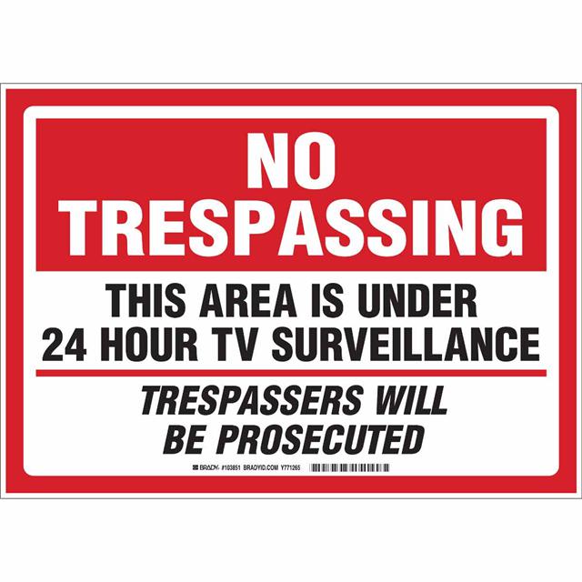 This is manufactured by Brady Corporation. The manufacturer part number is 103851. Label with a size of 14.00" l x 10.00" w (355.6mm x 254.0mm). The product is rohs3 compliant. It is assigned with possible HTSUS value of 3926.90.9985. It is shipped in bulk package . It has a classic black and red legend, white background colour. The product brady®, is a highly preferred choice for users. The product is made from highly stable and reliable polyester. In addition, it is reach unaffected. Its typical moisture sensitivity level is not applicable. A bespoke label is a no trespassing. this area is under 24 hour tv surveillance trespassers will be prosecuted label. The product is suitable for use with warning. It has a long 4 weeks standard lead time. The product is designated with the ear99 code number.