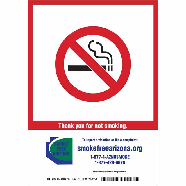 This is manufactured by Brady Corporation. The manufacturer part number is 104059. Label with a size of 14.00" l x 10.00" w (355.6mm x 254.0mm). The product is rohs3 compliant. It is assigned with possible HTSUS value of 3926.90.9989. It has a classic black, blue, green and red legend, white background colour. The product brady®, is a highly preferred choice for users. The product is made from highly stable and reliable polyester. In addition, it is reach unaffected. Its typical moisture sensitivity level is not applicable. In addition, bulk is the available packaging type of the product. A bespoke label is a thank you for not smoking label. The product is suitable for use with notice. It has a long 4 weeks standard lead time. The brady corporation's product offers user-desired applications. The product is designated with the ear99 code number.
